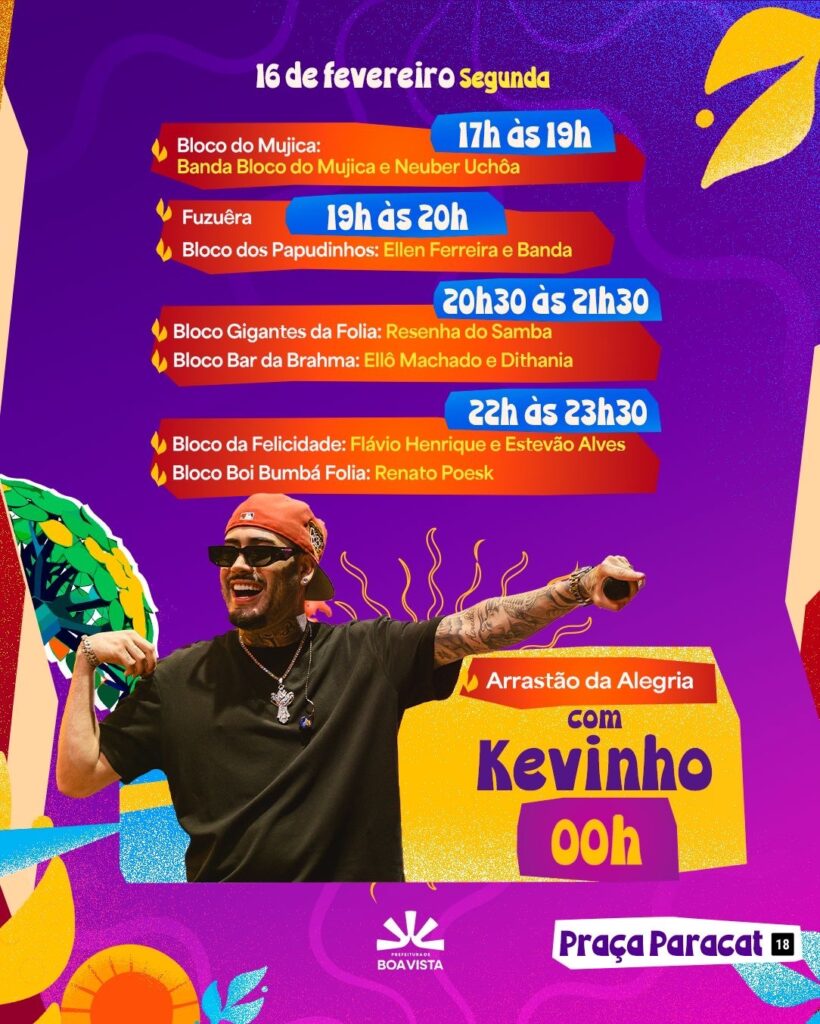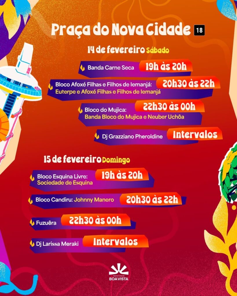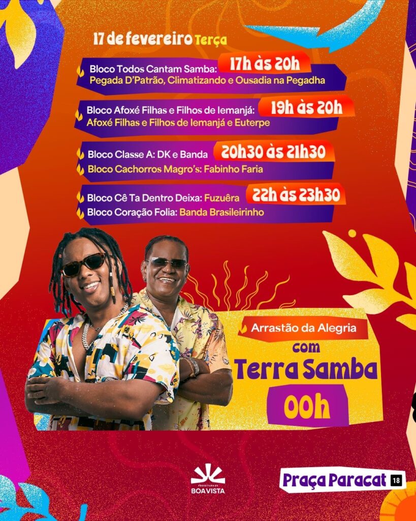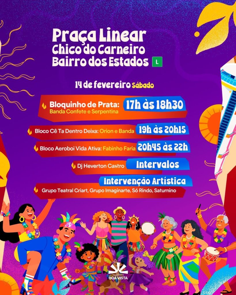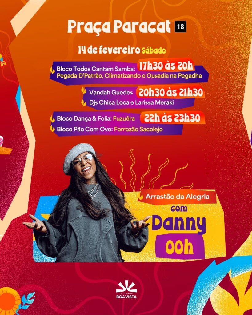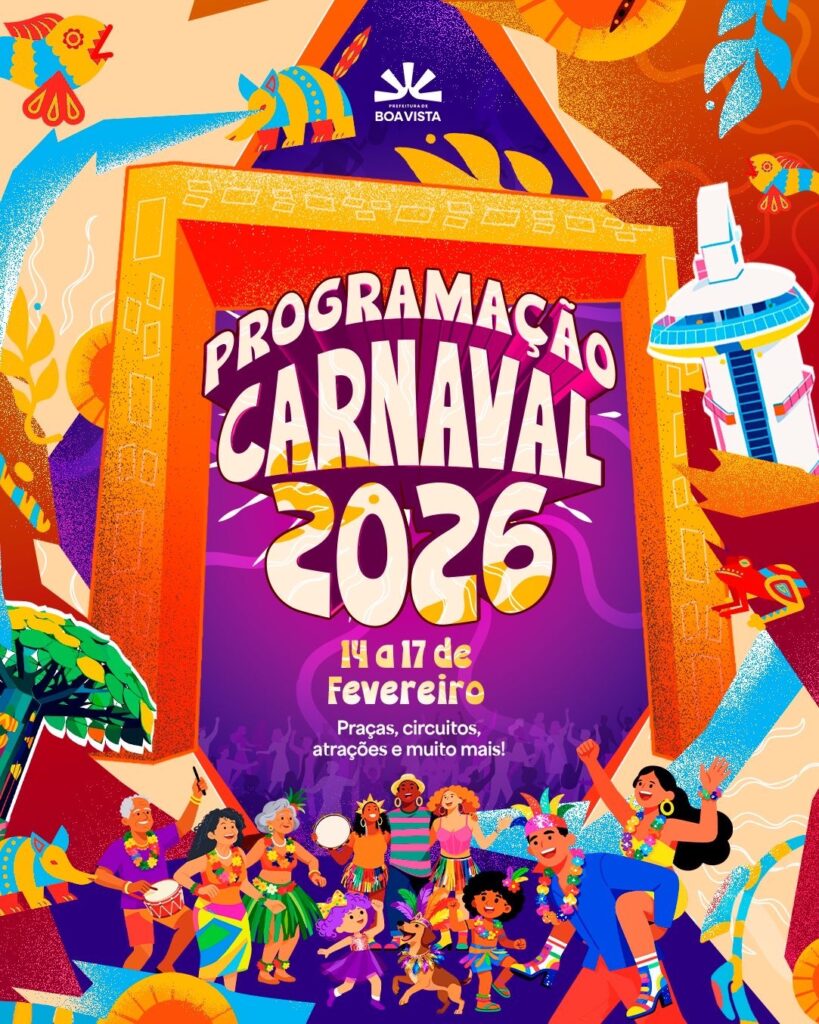 Com uma programação diversificada em praças de Boa Vista, o “Carnaval 2026: Nosso Bloco Junto com Você” começa no próximo sábado, 14 e segue até terça-feira, 17. Blocos de rua, Kevinho, Terra Samba, Danny, Diário de Mika, Bento e Totó estão entre as atrações que prometem animar a cidade com muita cor, música e alegria; além da segurança garantida, reforçando o espírito carnavalesco de Boa Vista.