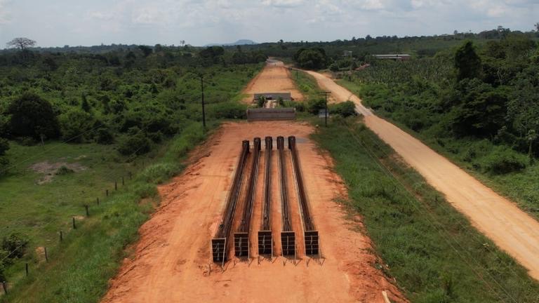Com exceção da ponte sobre o Rio Caroebe, que permanece na fase inicial para implantação dos desvios, as demais frentes de serviço já registram avanços significativos. Até o momento, foram executados a construção dos aterros, a implantação de desvios, a armação passiva e a instalação de cordoalhas de protensão em todas as OAEs em andamento