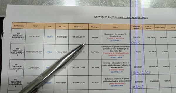 O inquérito traz o print de uma foto enviada por Edilson Damião para Clóvis Braz. A imagem mostra uma planilha de emendas parlamentares. Nela, ao lado de uma obra no município de Iracema, orçada em mais de R$ 1 milhão, o nome “Clóvis” aparece escrito à mão. Veja abaixo.