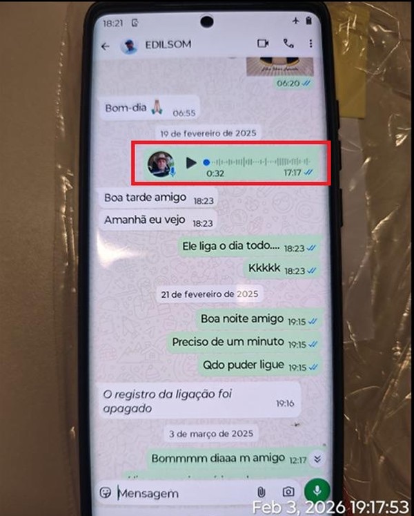 O relatório também destaca um áudio enviado por Clóvis a Damião. Na gravação, o empresário pergunta sobre o pagamento de um serviço e revela que Disney Mesquita já havia confirmado a liberação do dinheiroantes mesmo da própria Seinf.