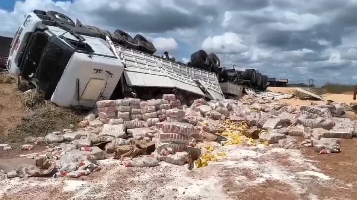 A carreta transportava carga de farelo de soja e arroz, havendo derramamento do material fora da pista de rolamento, sem interferência direta no fluxo de veículos. Na ocasião, foi constatado que não houve vítimas, apenas danos materiais no veículo.