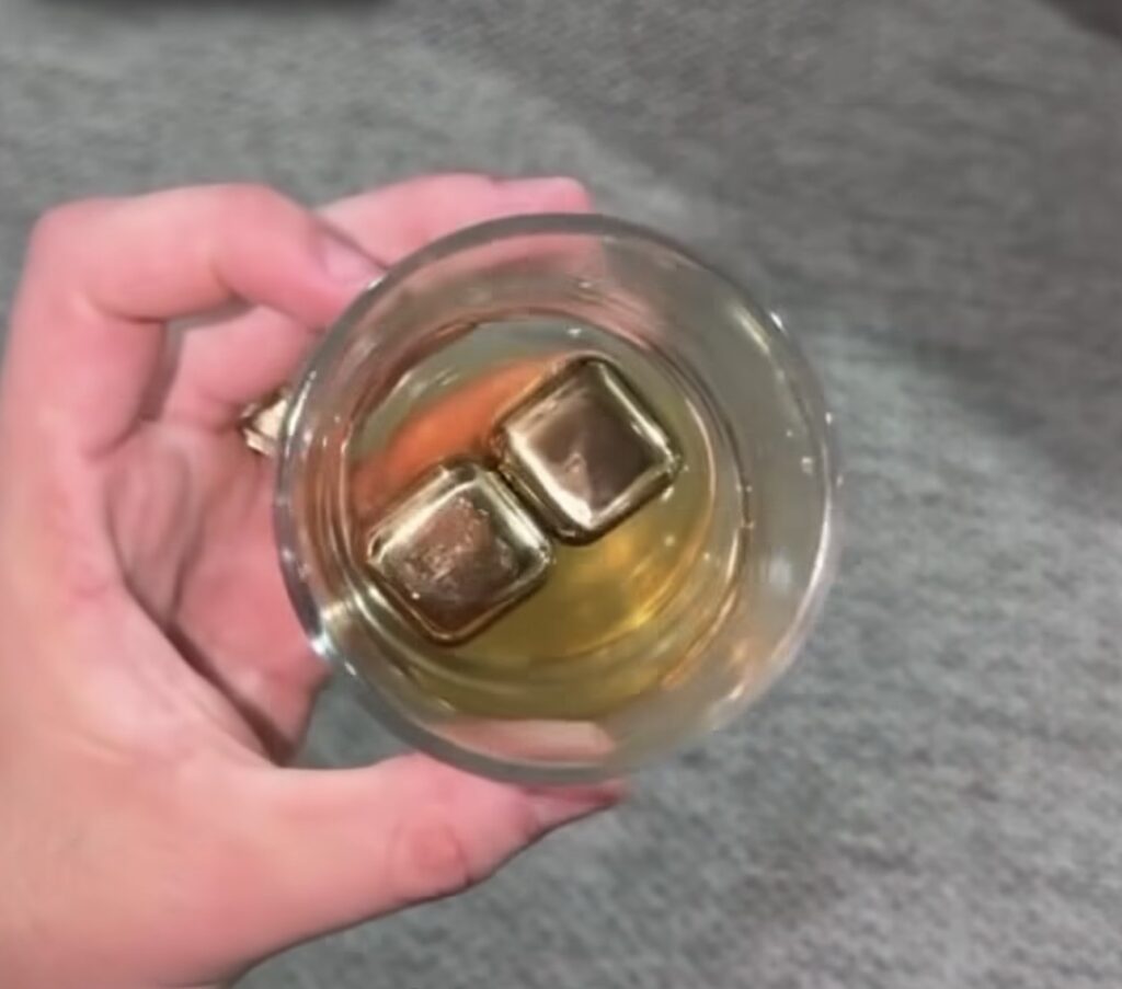 O músico mostra um copo de Uísque com duas pedras de ouro em formato de cubo que, segundo o cantor serviam para gelar a bebida. No vídeo Natanzinho informa que recebeu um total de 6 cubos.